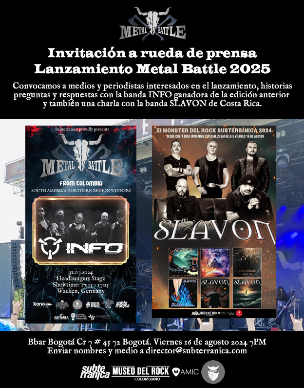 ATENTOS Rueda de prensa de lanzamiento de Metal Battle Suramérica 2025. Una charla con INFO respecto a su experiencia en la pasada edición y aclaración de términos de este año. También tendremos una rueda de prensa con la banda SLAVON que nos visita desde Costa Rica y estará invitada en la batalla de El Monster del Rock así como en varios festivales en el país. ENVIAR NOMBRE DE PERIODISTAS Y MEDIO a director@subterranica.com para la lista de ingreso.