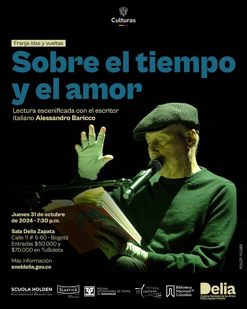 ‘Sobre el tiempo y el amor’ es una puesta en escena coproducida con Elástica Srl, Carnezzeria Srls y la Scuola Holden. La visita de Alessandro Baricco al Centro Nacional de las Artes Delia Zapata Olivella se hace con el apoyo del Festival Internacional de Teatro de Manizales y la vinculación del Instituto Italiano di Cultura di Bogotá.