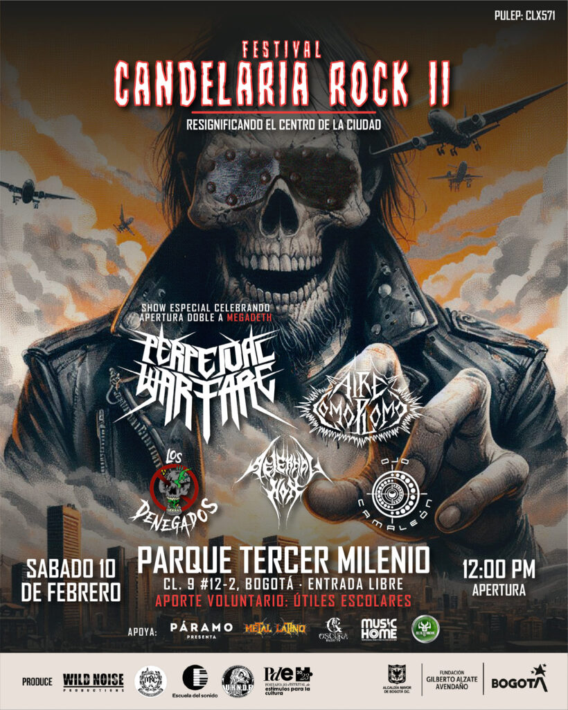 Este 10 de Febrero, los rockeros y metaleros de la ciudad de Bogotá, tienen una cita en el parque Tercer Milenio para celebrar la segunda edición del Festival Candelaria Rock, que este año tendrá en su cartel una gran variedad de géneros y artistas reconocidos del país. La cuota principal del evento, será encarnada por Perpetual Warfare y Aire Como Plomo.
