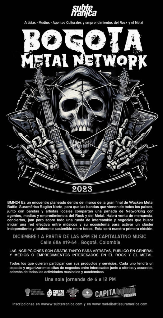 El viernes 1 de diciembre de 2023, como antesala de la gran final regional de Wacken Metal Battle Suramérica Región Norte tendremos un encuentro de trabajo y creación de lazos con las bandas que vienen de Venezuela y Ecuador, con el representante de Wacken Open Air que nos visitará y con todas las marcas, emprendimientos, servios y personas que quieran asistir. El evento se llevará a cabo en Capital Latino Music en Bogotá a partir de las 6PM y hasta las 2AM. Pero las exposiciones y ruedas de negocios van hasta las 11PM. A partir de ese momento habrá Jam Session y presentaciones artísticas.