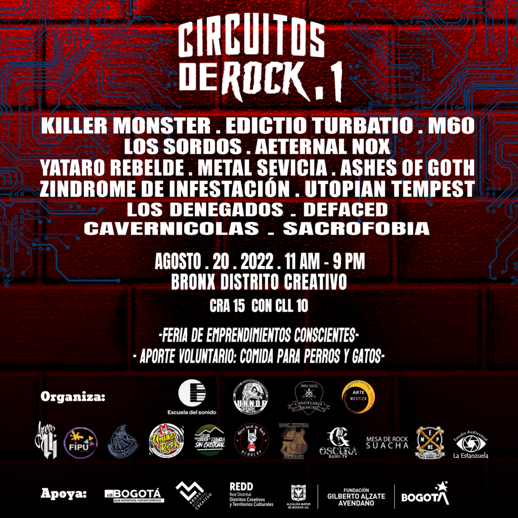 Circuitos de Rock 1, es liderado por las mesas de rock de las agrupaciones participantes y diferentes organizaciones independientes, a partir de la iniciativa de la Mesa de Rock de La Candelaria. También cuenta con el apoyo de la FUGA (Fundación Gilberto Alzate Avendaño), entidad que abre la posibilidad de realizar la jornada musical en un espacio icónico de la ciudad: Bronx Distrito Creativo, ubicado en la localidad de Mártires (Cra 15 con calle 10). Evento con entrada libre.