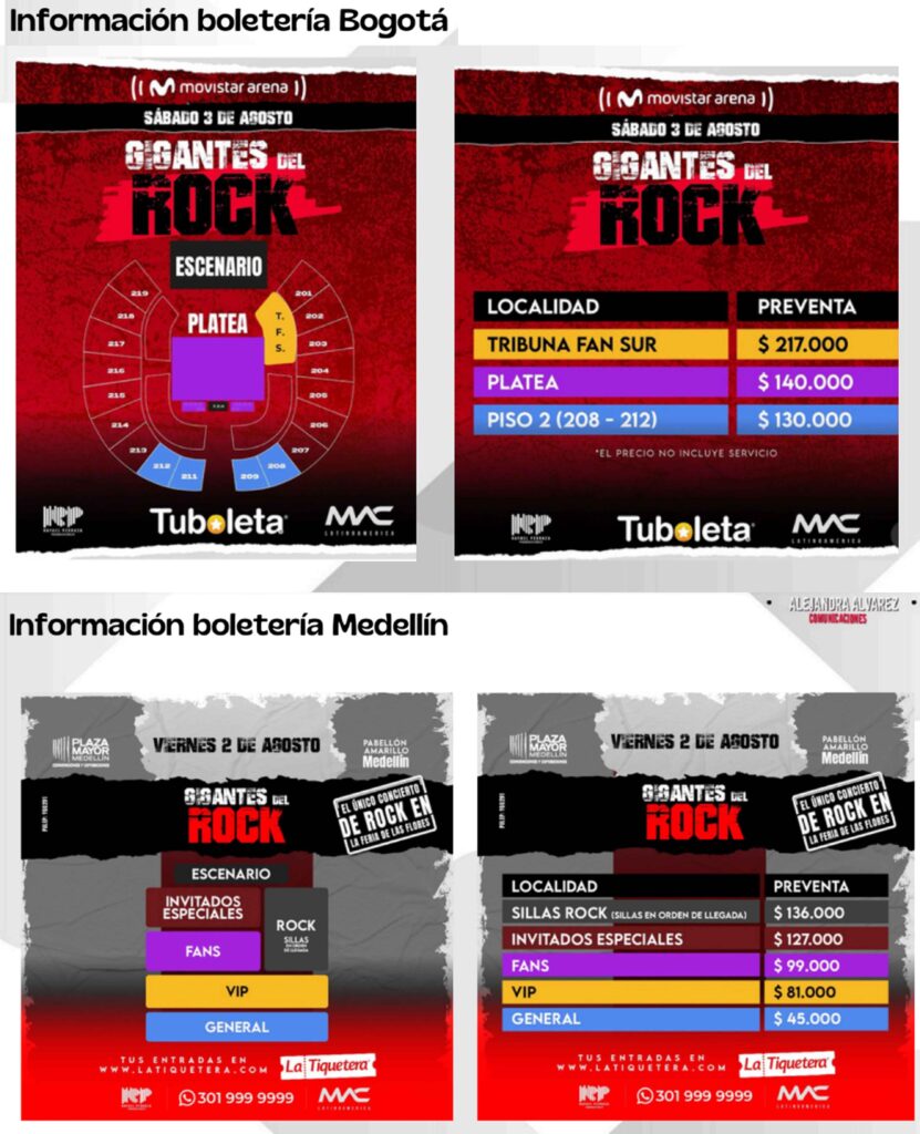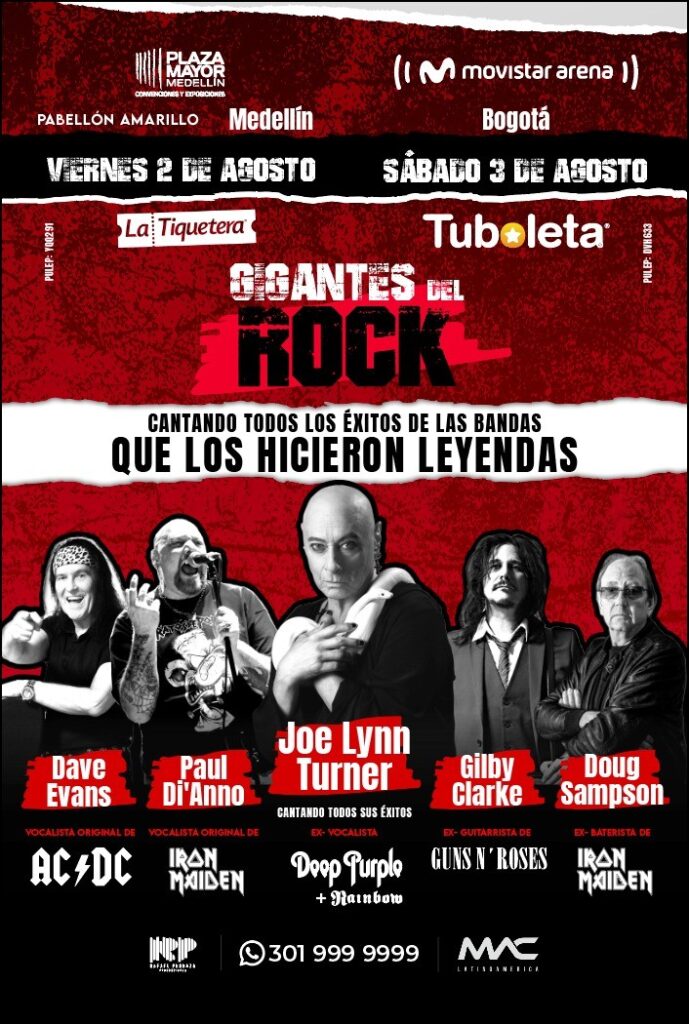 Medellín vibrará al ritmo de las guitarras, la batería y la potente voz de los talentos que traerán al país la vibra rockera más poderosa de la mano de los “Gigantes del Rock”la cita es el próximo viernes 2 de agosto en el Pabellón Amarillo de Plaza Mayor. Por su parte Bogotá vibrará al ritmo del rock en el Movistar Arena, en lo que será la cita perfecta de los amantes del rock clásico en la capital. La edad mínima para asistir al concierto es de 18 años Las boletas para Bogotá están disponibles en @TuBoleta y para la capital de Antioquia se encuentran en @LaTiquetera.