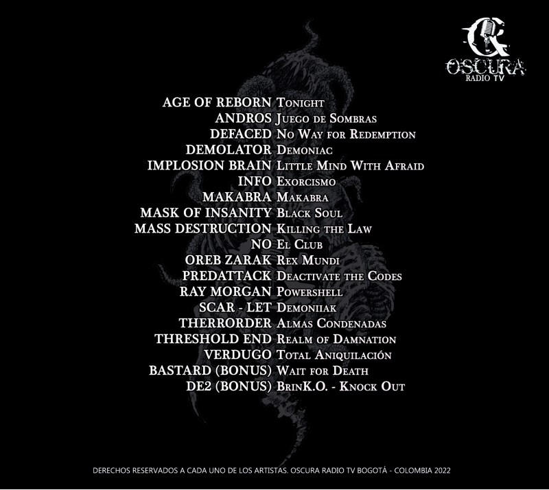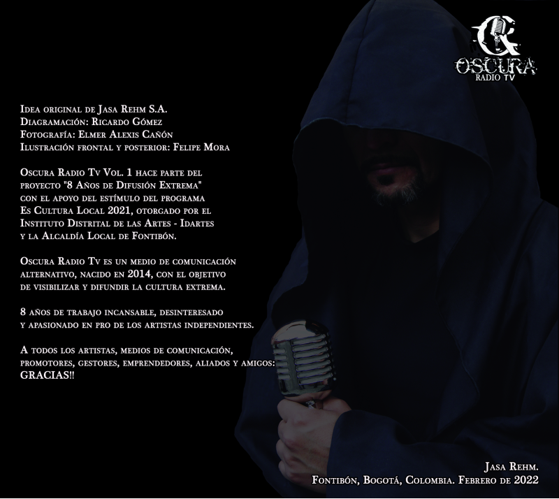 Hijo de esos “8 años de difusión extrema”, Oscura Radio Tv presenta el primer volumen de una compilación que recoge 19 de canciones de un mismo número de bandas que han dejado su huella en la prolífera historia del metal nacional. Partiendo desde Fontibón, pasando por Bogotá y extendiéndose hacia Colombia, las bandas llamadas a participar de este recorrido musical, también pasaron por los estudios del programa radial transmitido cada ocho días a las ocho de la noche.
