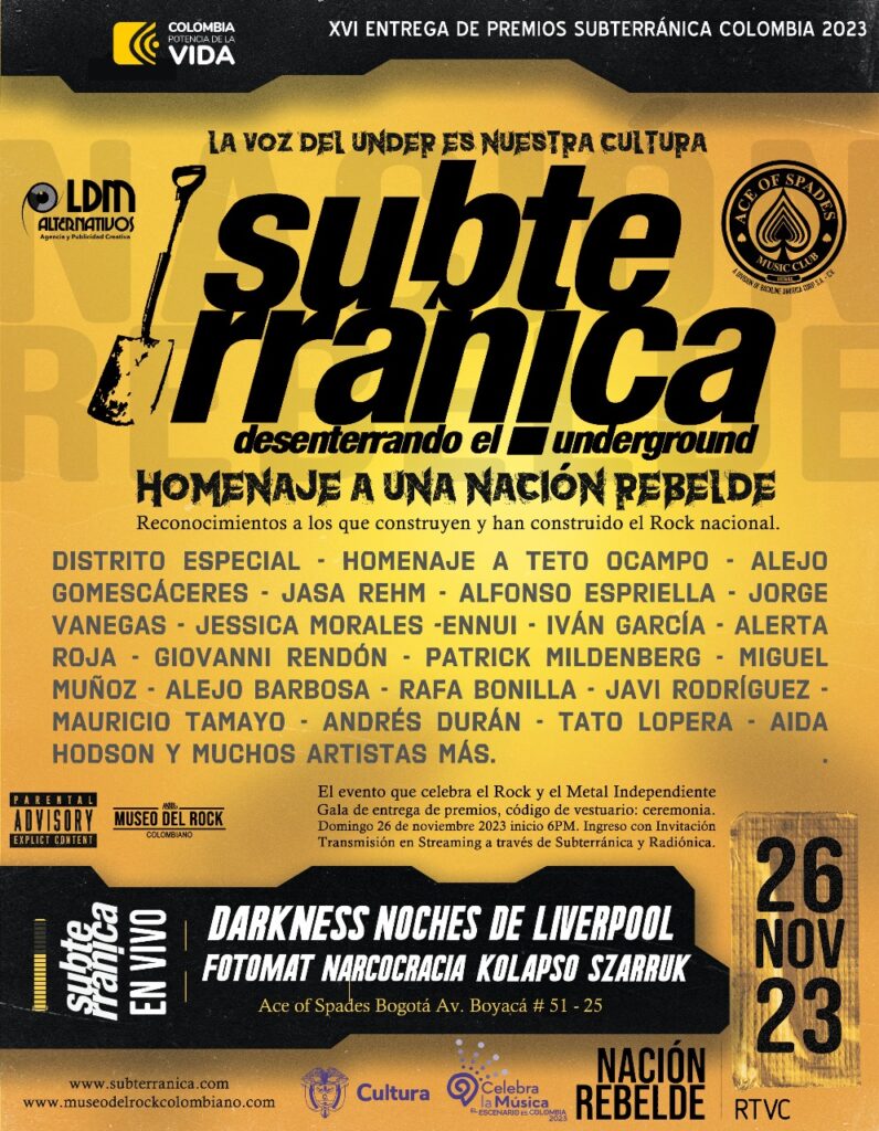 La XVI Entrega de Premios Subterránica Colombia se llevará a cabo en Ace of Spades Bogotá, con acceso solo por invitación, pero se podrá ver en streaming a través de las redes de Subterránica y RTVC, también habrá cobertura en Radiónica. Así, Subterránica cumple 16 años de premios en Colombia y más de dos décadas de aporte y actividad al rock con este homenaje a sus protagonistas, todo esto se da apenas después de que Felipe Szarruk, fundador del movimiento Subterránica, anunciara grandes cambios en las dinámicas de estos galardones.