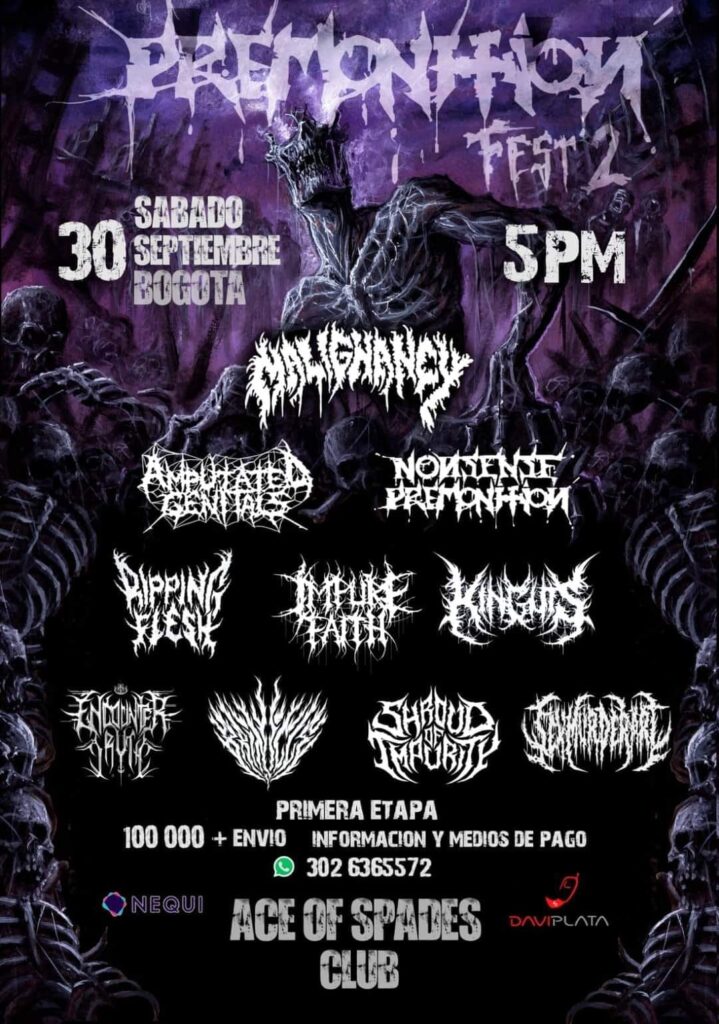 Junto a ellos, unos auténticos puntales del género: Premonition Fest recibe todo el poderío de MALIGNANCY desde New York. Con treinta años de inflexible barbarie musical, la leyenda comandada por Danny Nelson es la cuota internacional de esta fiesta de metal pesado. La premonición se hará realidad este 30 de septiembre en Ace of Spades, con entradas a $100.000 y sorpresas que no querrán perderse. Las entradas ya pueden ser adquiridas vía electrónica con pagos habilitados vía Nequi y Daviplata al número 3026365572.
