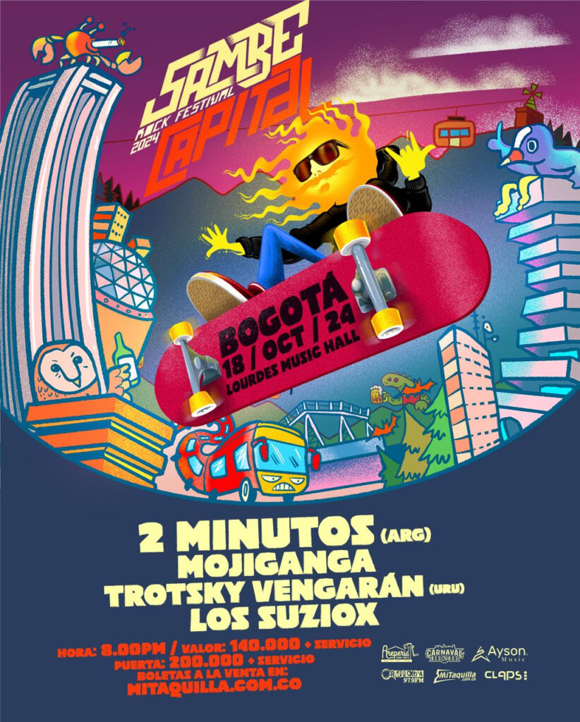 El SAMBE ROCK FESTIVAL, originado en la ciudad de Medellín en 2022, confirma su primera edición en Bogotá bajo el nombre de SAMBE CAPITAL, con un cartel maravilloso que reúne agrupaciones de distintos países latinoamericanos, 2 MINUTOS (ARG), TROTSKY VENGARÁN (URU), MOJIGANGA (MED) y LOS SUZIOX (COL).