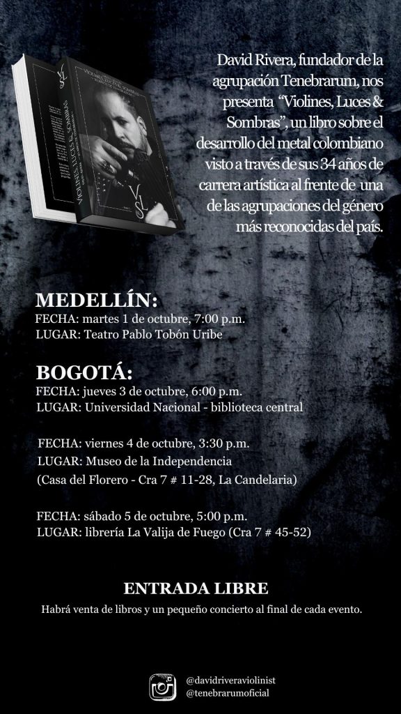 David Rivera, violinista y fundador de la legendaria agrupación Tenebrarum, presenta el libro de su autoría “Violines, Luces & Sombras”. Sus páginas relatan en primera persona el desarrollo del metal colombiano, visto a través de sus 34 años al frente de una de las bandas del género más representativas del país.