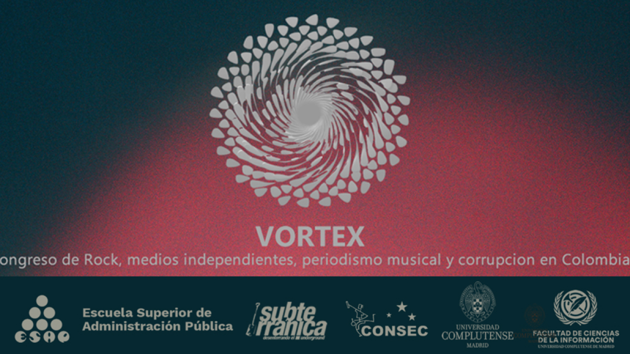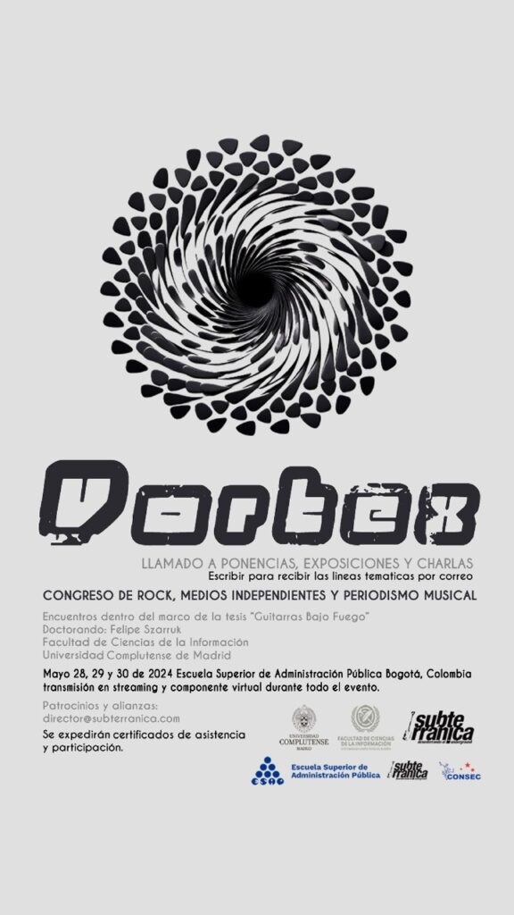 El próximo martes, da inicio VORTEX, un congreso de rock, metal, periodismo musical y medios independientes, con un eje transversal en la corrupción de las instituciones públicas y privadas que apoyan la cultura en Colombia. Este evento forma parte de la investigación de la tesis «Guitarras Bajo Fuego» del Doctorado en Periodismo de la Universidad Complutense de Madrid, dirigido por Felipe Szarruk y con Hector Fouce como tutor.